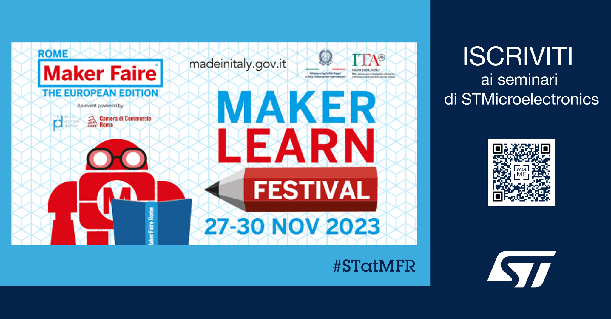 STMicroelectronics partecipa al festval con 5 webinar gratuiti, aperti a tutti tramite collegamento alla piattaforma Zoom di Maker Faire Rome.