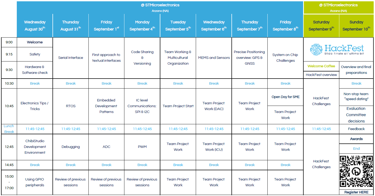 L’ evento, promosso da STMicroelectronics in collaborazione con le Università della Campania, è indirizzato agli studenti delle lauree triennali e magistrali che si vogliono avvicinare all’uso di piattaforme basate sui microcontrollori a 32 bit e Sistemi Operativi Real Time. Il programma prevede 10 giorni di seminari intensivi e hands-on dal vivo.