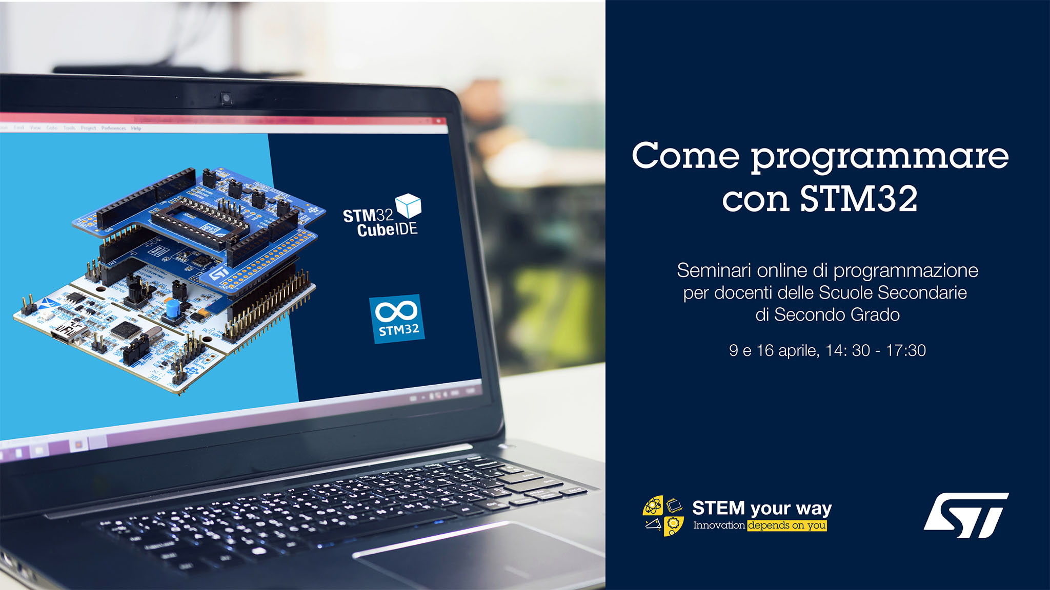 Webinar dedicato ai docenti delle scuole secondarie di secondo grado sulla programmazione della scheda a microcontrollore STM32 –  Nucleo F401RE di STMicroelectronics – con l’ambiente di sviluppo STM32CubeIDE. Durante il corso, Alessandro Nicolosi, Analog Design Staff Engineer, e Alessandro Ballio, NVM Design Engineer di STMicroelectronics, presentano l’ambiente di sviluppo STM32CubeIDE per la programmazione della scheda Nucleo F401RE, per chi si avvicina al mondo della programmazione dei microcontrollori e desidera sfruttare l’ecosistema hardware e software di sviluppo per STM32.