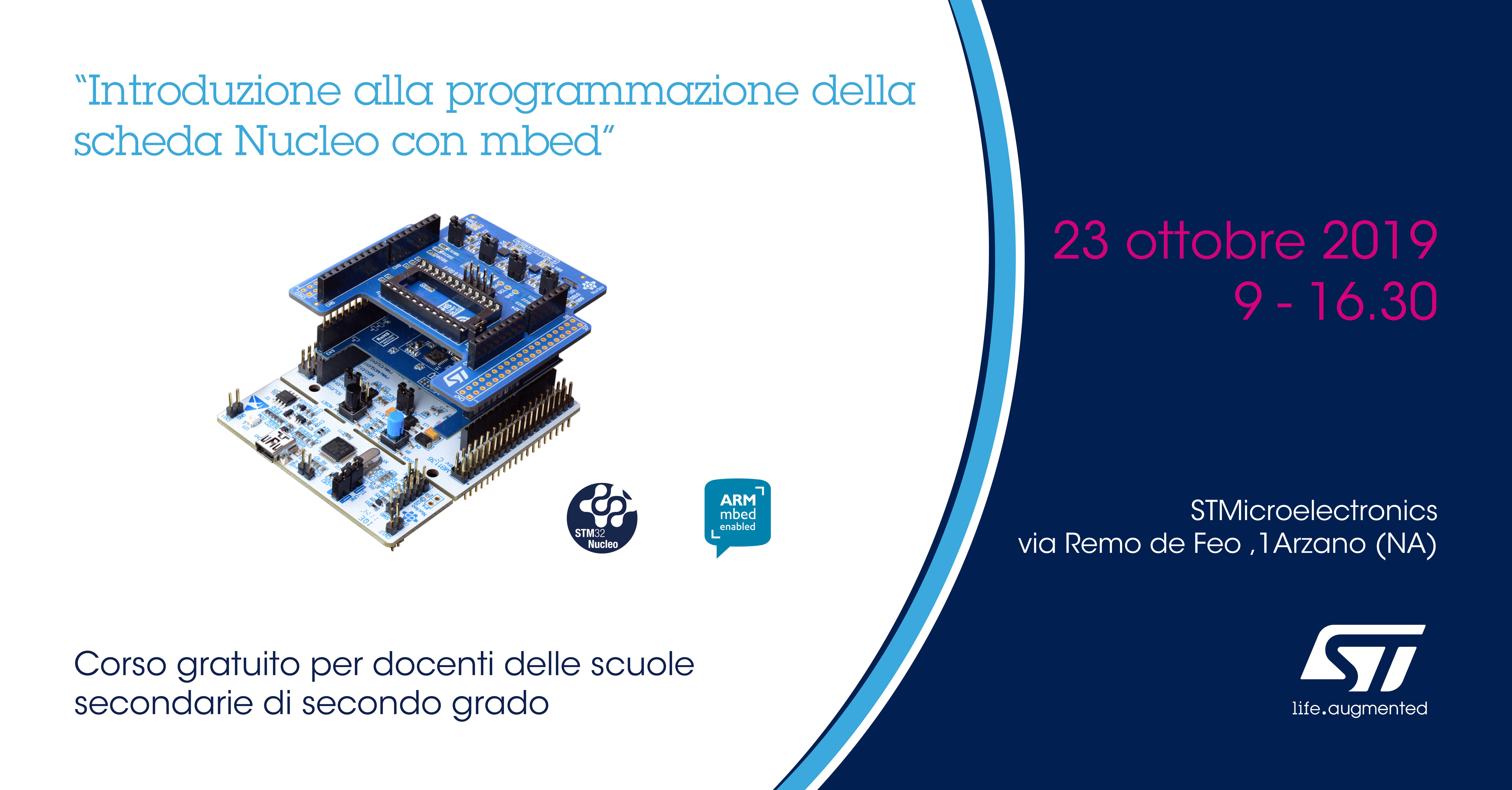 Aperte le iscrizioni al corso dedicato ai docenti delle scuole secondarie di secondo grado e riguardante la programmazione di una scheda a microcontrollore STM32, la Nucleo F401RE di STMicroelectronics, con l’ambiente di sviluppo mbed di ARM.
