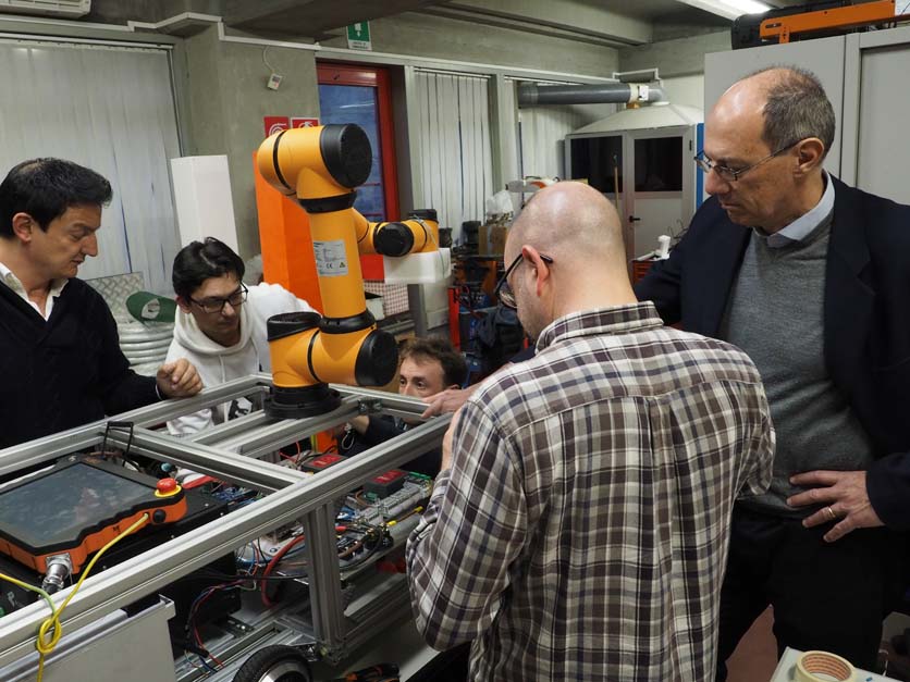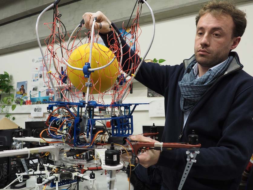 In laboratorio si monta anche il robot terrestre che gareggerà nella seconda challenge. «L’abbiamo progettato e costruito – spiega Luciano Cantelli, anche lui “veterano” di Mbzirc – tutto noi, è dotato di un braccio mobile che avrà il compito di raccogliere dei mattoncini colorati e costruire un muro». Ad affiancare il robot ci saranno anche dei droni per sollevare, trasportare e rilasciare i mattoni, «grazie a una piastra magnetica che abbiamo interamente progettato e stampato», aggiunge Dario Guastella, illustrando il meccanismo.