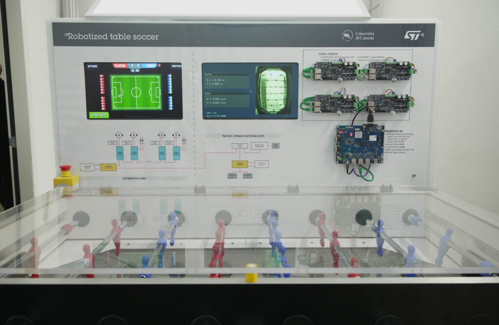 Un calcio balilla robotico per giocare da soli contro un’intelligenza artificiale? In realtà il calcio balilla progettato da STMicroelectronics in collaborazione il Laboratorio di Sistemi Autonomi del Dipartimento di Matematica e Informatica (ARSLab) dell’Università di Catania ha altri scopi. Prima di tutto è un dimostratore dei prodotti  di ST progettati per la factory automation e per la robotica. Nel caso specifico, otto motori, quattro di rotazione e quattro di traslazione, azionano le aste dei giocatori. Da un lato del tavolo, quello da cui gioca l’intelligenza artificiale. Infatti, un sistema di visione artificiale effettua il riconoscimento della pallina sul campo di gioco, e un sistema intelligente provvede, attraverso un strategia adattativa, a identificare la traiettoria e la velocità della palla, generando i comandi per l’azionamento dei motori delle aste.