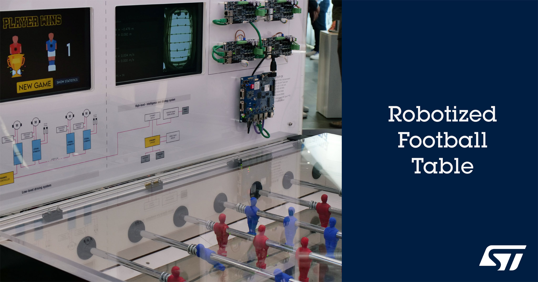 Non ci resta che partire per Norimberga per avere una chance di vincere la sfida. Dopo, sarà ancora più difficile."Diagramma che illustra l'architettura di un sistema di controllo motorio e strategia AI per un calcetto robotizzato. A sinistra, sotto la sezione 'Motor Control', sono rappresentati i componenti del sistema di guida a basso livello, inclusi i motori, i driver e i microcontrollori. A destra, sotto la sezione 'AI Strategy & Vision', sono rappresentati i componenti del sistema di intelligenza e strategia ad alto livello, inclusi i moduli di visione artificiale e strategia AI. Le due sezioni sono collegate tra loro, mostrando l'interazione tra il controllo motorio e la strategia AI.Immagine di un calcetto robotizzato in esposizione. La parte superiore mostra due schermi: uno con il messaggio 'PLAYER WINS' e un altro con dati di gioco. Sulla destra, sono visibili diverse schede elettroniche STMicroelectronics montate su una superficie bianca. La parte inferiore dell'immagine mostra il campo da gioco del calcetto con omini rossi e blu. Sullo sfondo, si intravedono alcune persone.