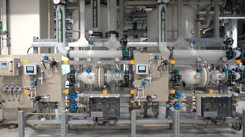 L’acqua estratta dalla prima falda, a questo stadio definita “grezza”, viene quindi incanalata in due differenti circuiti. Il 30% di essa viene impiegata per utilizzi civili e industriali (ad esempio per le centrali frigorifere, gli scarichi dei bagni e l’antincendio), mentre il restante 70% confluisce  negli impianti di produzione di ’acqua ultrapura – denominati con l’acronimo inglese UPW (UltraPure Water) – che la trattano secondo specifiche stabilite a livello produttivo per poterla utilizzare nel risciacquo dei wafer. “Il cuore di questo processo è detto osmosi inversa e – spiega Quartini – consiste in un filtraggio a pressione sempre più serrato dell’acqua fino ad eliminarvi l’organico a livello di parti per bilione, ioni e cationi a livello di parti per trilione”. Tutti spremuti via.