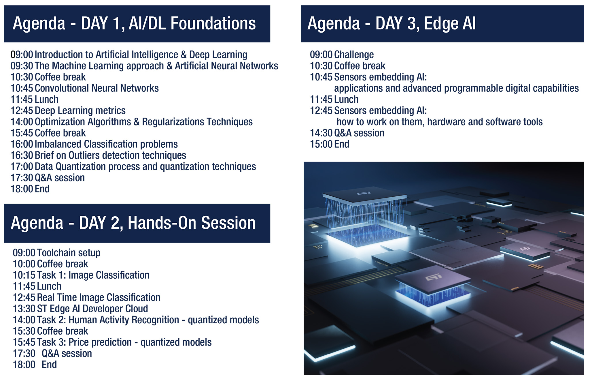 STMicroelectronics ha preparato questo corso pensando ad esperti dell’industria, agli studenti, ai ricercatori universitari e ai giovani professionisti che sono interessati al tema dell’intelligenza artificiale su microcontrollori, argomento quanto mai attuale grazie alle molteplici opportunità che offre.